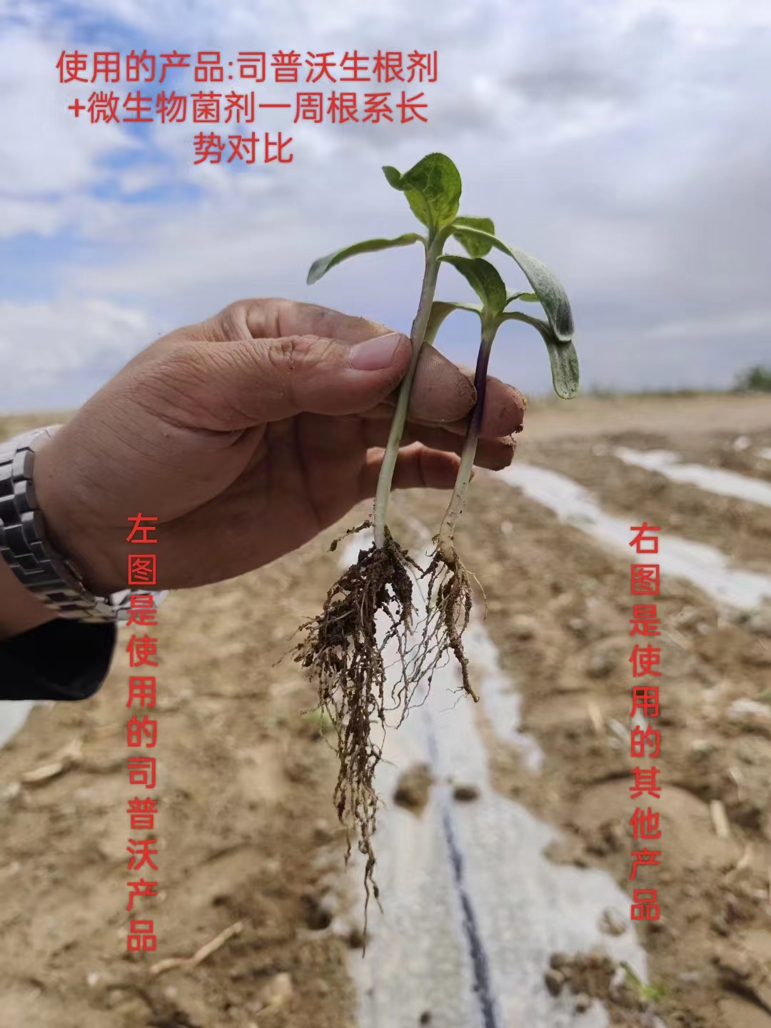 新疆葵花沖施司普沃“三活三抗”套餐,根系發(fā)達(dá)健壯,根多根壯,植株長勢健壯,而使用其他產(chǎn)品根系相對(duì)少,植株相對(duì)較瘦弱,對(duì)比明顯。